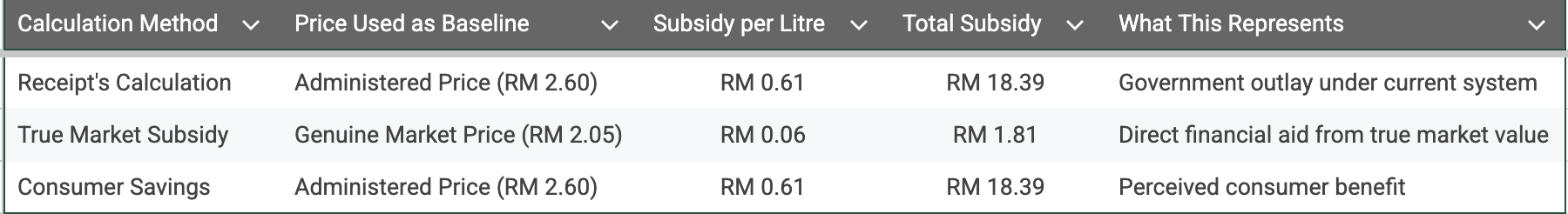 The receipt's RM 18.39 figure represents the Government Outlay—the revenue forgone by selling at RM 1.99 instead of the official administered price of RM 2.60. This combines two distinct elements: price control benefits and direct subsidy.