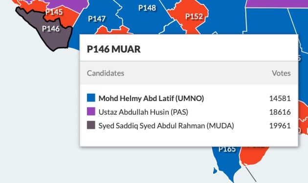 Why is that so? Muda did not garner more than 60,000 votes in the entire Johor state elections. It did not get more than 30,000 in the Selangor state elections altogether. Syed Saddiq won the seat in a close fight between him, the Umno candidate and the PAS candidate. (See the table below). PH gave way to Saddiq. Had the PH contested the seat, Saddiq would have been defeated, most likely.